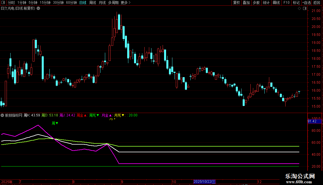 周K:MA("KDJ.K#WEEK"(N,M1,M2) ,5),LINETHICK2,COLORWHITE;