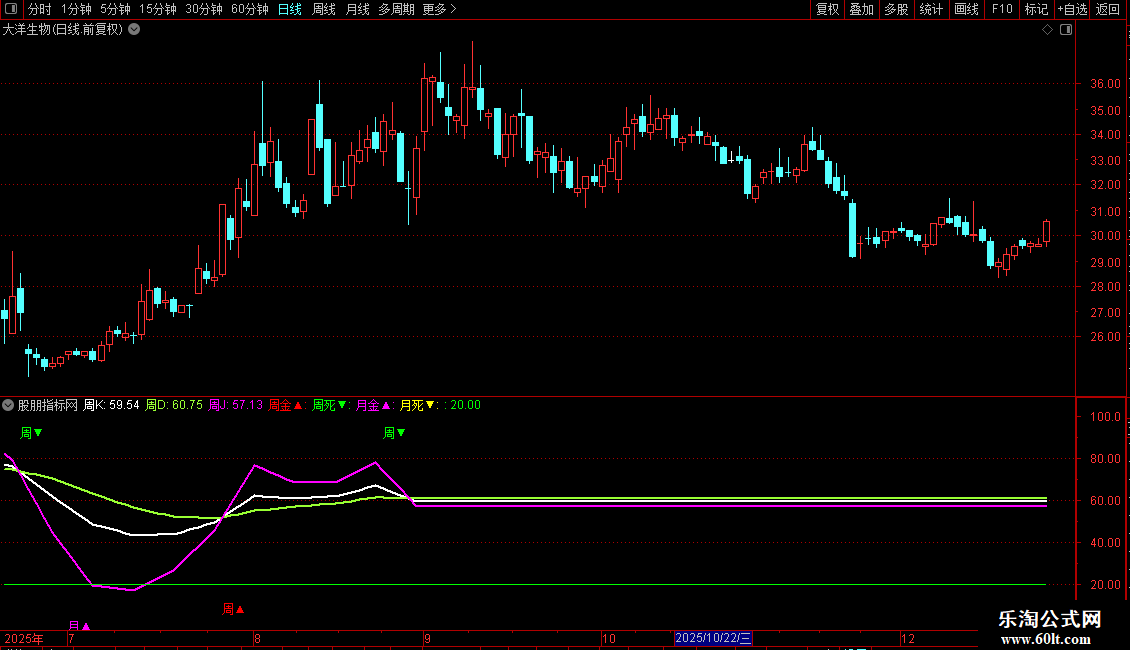 周死▼:DRAWTEXT(CROSS("KDJ.D#WEEK"(N,M1,M2),"KDJ.K#WEEK"(N,M1,M2)) ,92,'周▼'),COLORGREEN;