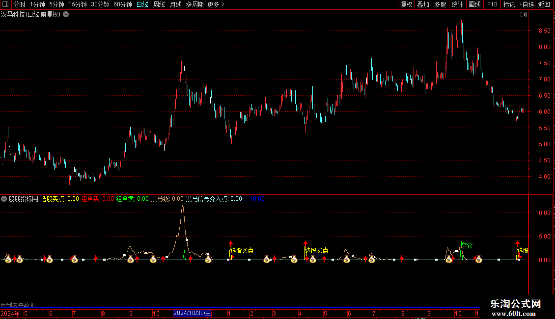 DRAWTEXT(黑马信号介入点>0,4.5,'●我的黑马介入点'), , COLORRED;
