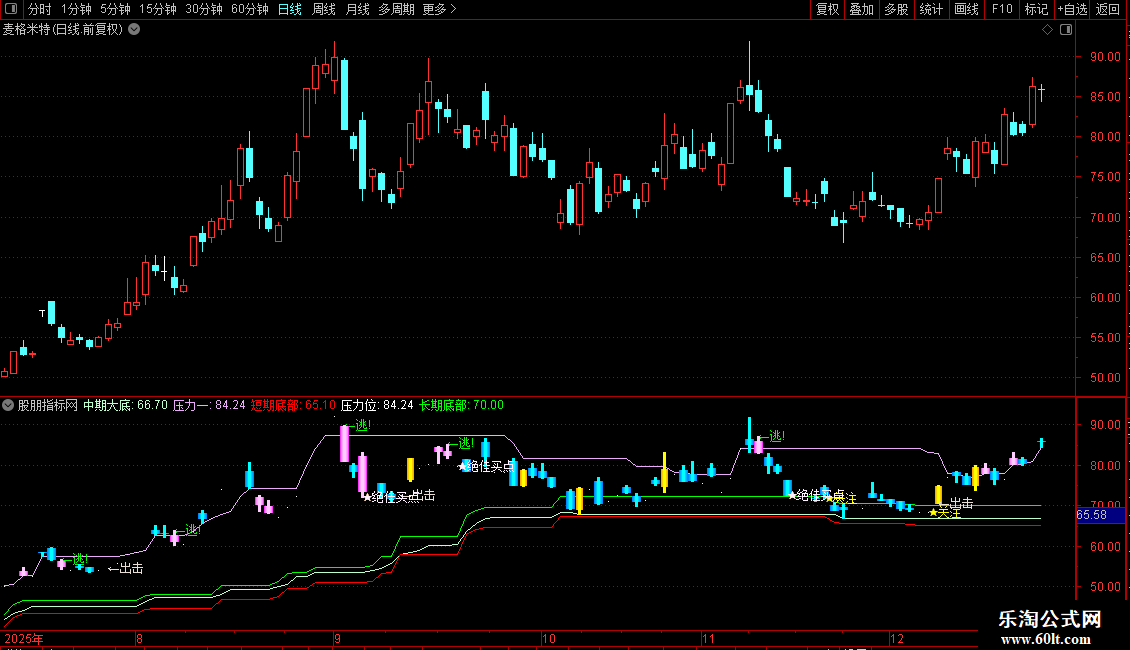 DRAWTEXT(((CROSS(MA20,压力位) AND (LOW <= MA20)) AND ((MA20 - REF(MA20,1)) > 0.02)),(LOW - 0.03),'★绝佳买点'),COLORFFF0FF;