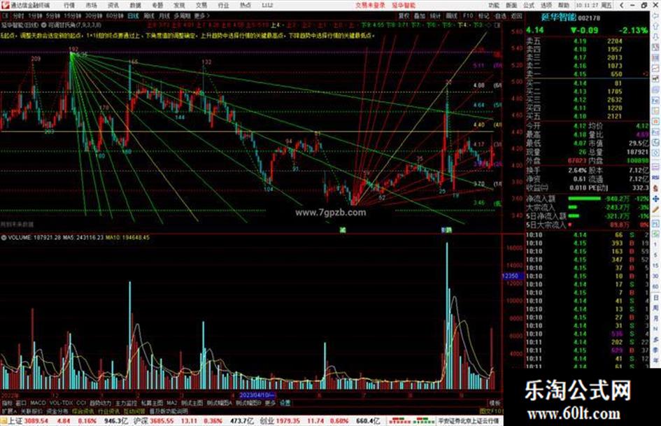 DRAWTEXT_FIX(1,0.75,0.01,1,'江恩角度线在缺省值是200天周期内自动选择高、低起点,调整天数会选定新的起点,1×1线的终点要通过上、下角度值的调整确定,上升趋势中选择行情的关键最高点,下降趋势中选择行情的关键最低点。'),COLORYELLOW;