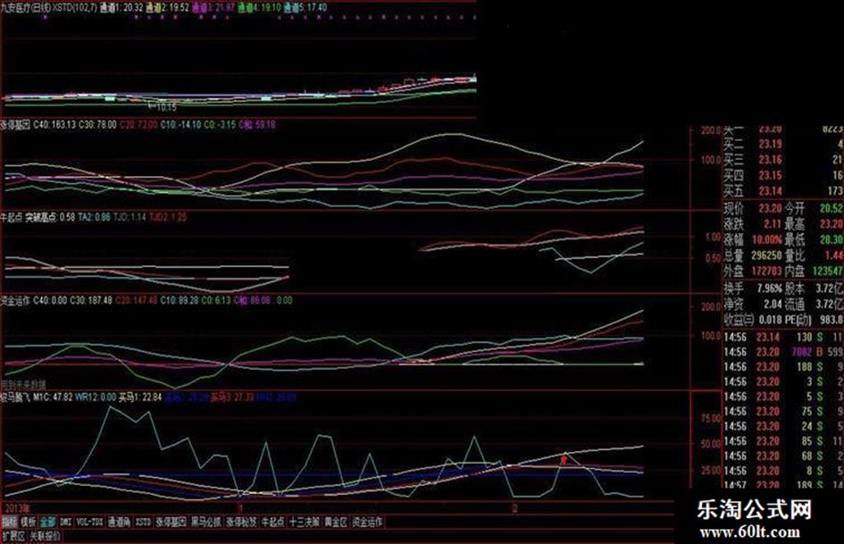 用法:当白线大于黄蓝线红线并且黄蓝线红线大于nn2,wr1小于nn2,只要白线向上走势,绝对有一波好涨停潮,特别是在白线最大几天后出现回调,wr1上穿后又下破时介人;