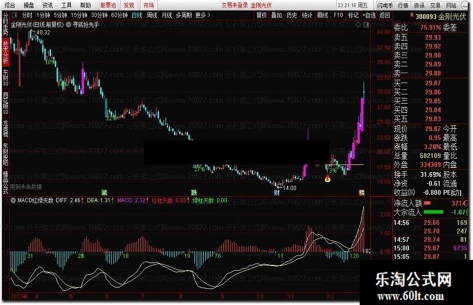{MACD红柱和绿柱天数}DIFF:EMA(CLOSE,12)-EMA(CLOSE,26),COLORWHITE;DEA:EMA(DIFF,9),COLORYELLOW;MACD:2*(DIFF-DEA),COLORSTICK,LINETHICK4;绿柱天:=BARSLAST(MACD>0)NODRAW;HSL100:=SUM(VOL/CAPITAL*100,BARSLAST(CROSS(DIFF,DEA))+1)-VOL/CAPITAL*100;HSL101:=SUM(VOL/CAPITAL*100,BARSLAST(CROSS(DEA,DIFF))+1)-VOL/CAPITAL*100;HSL102:=SUM(VOL/CAPITAL*100,BARSLAST(CROSS(DIFF,DEA))+1);HSL103:=SUM(VOL/CAPITAL*100,BARSLAST(CROSS(DEA,DIFF))+1);红柱天数:BARSLAST(MACD< 0),COLORRED,NODRAW;绿柱天数:REF(绿柱天,1),COLORGREEN,NODRAW;DRAWNUMBER(CROSS(DEA,DIFF),0.2,ROUND(HSL100)),COLORRED;DRAWNUMBER(CROSS(DIFF,DEA),-0.05,ROUND(HSL101)),COLORGREEN;DRAWNUMBER(MACD>0 AND ISLASTBAR,0.2,ROUND(HSL102)),COLORYELLOW;DRAWNUMBER(MACD<0 AND ISLASTBAR,-0.05,ROUND(HSL103)),COLORYELLOW;