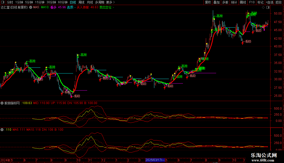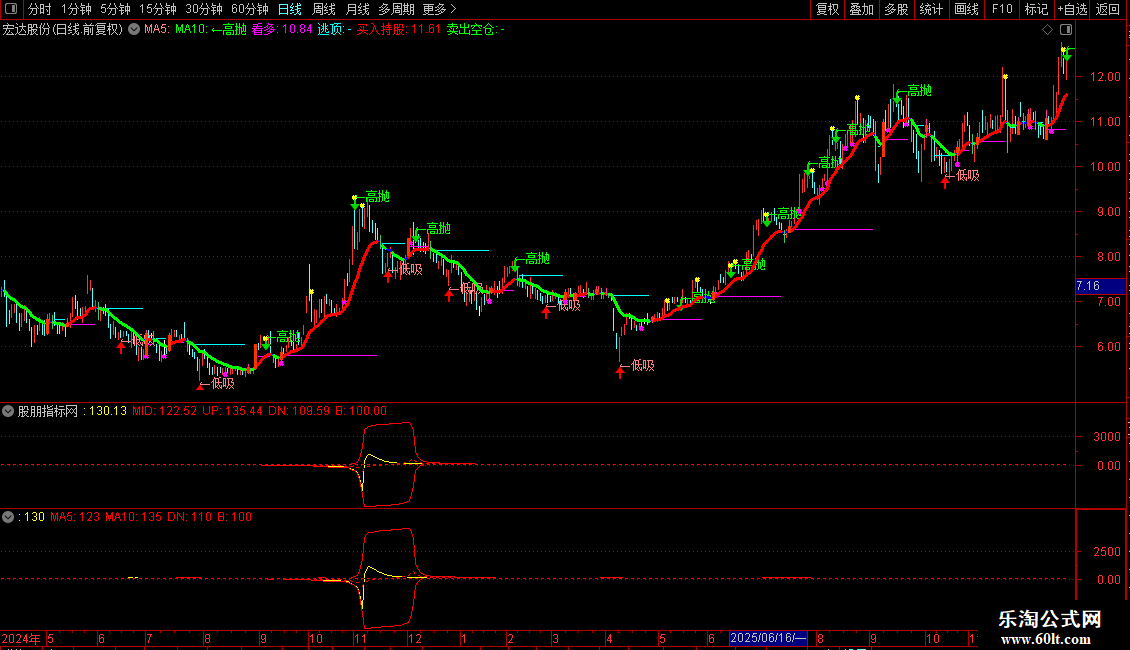 DRAWTEXT(CROSS(庄家,散户) AND 散户>70,H+0.05,'←高抛'),COLORGREEN;