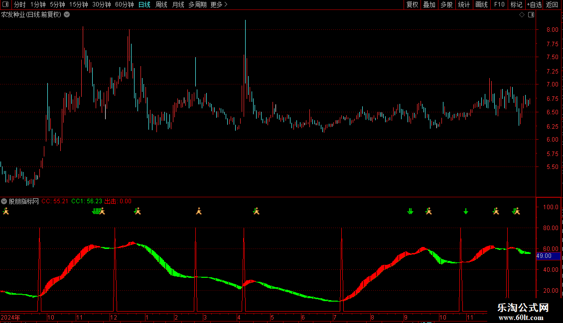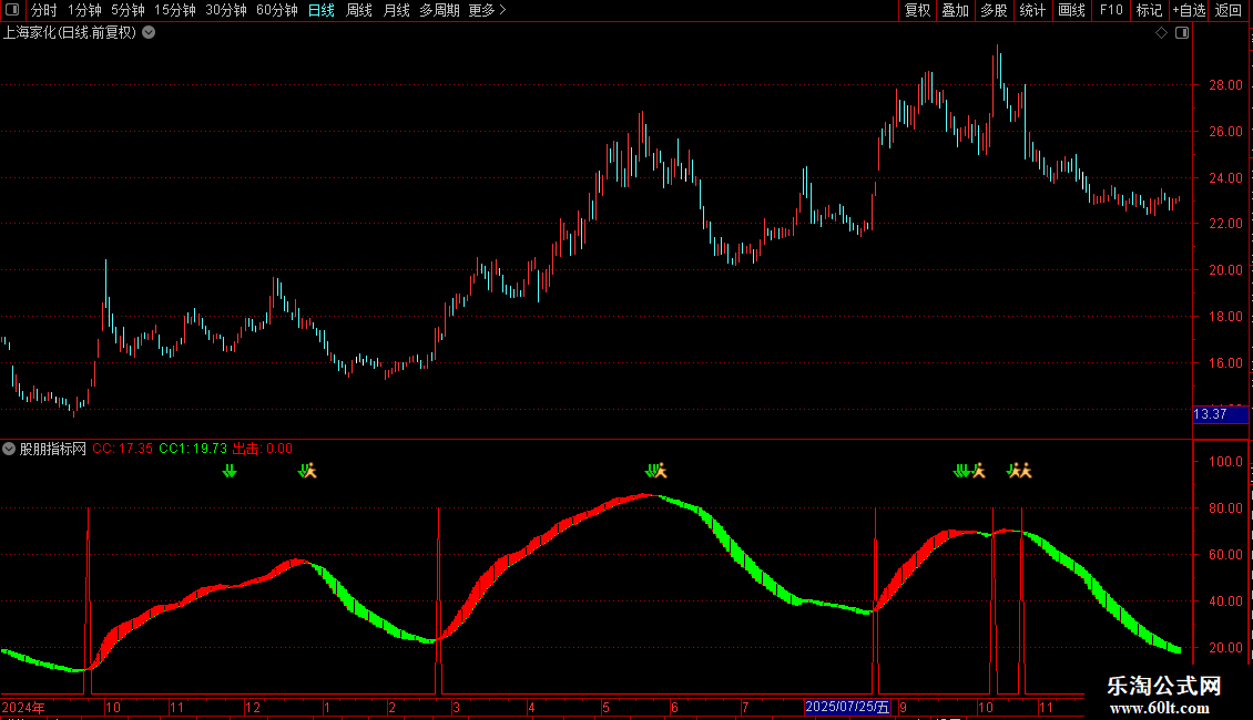 出击:IF((CROSS(CC,CC1) AND (CC1 < 顶) ),80,0),COLORRED;
