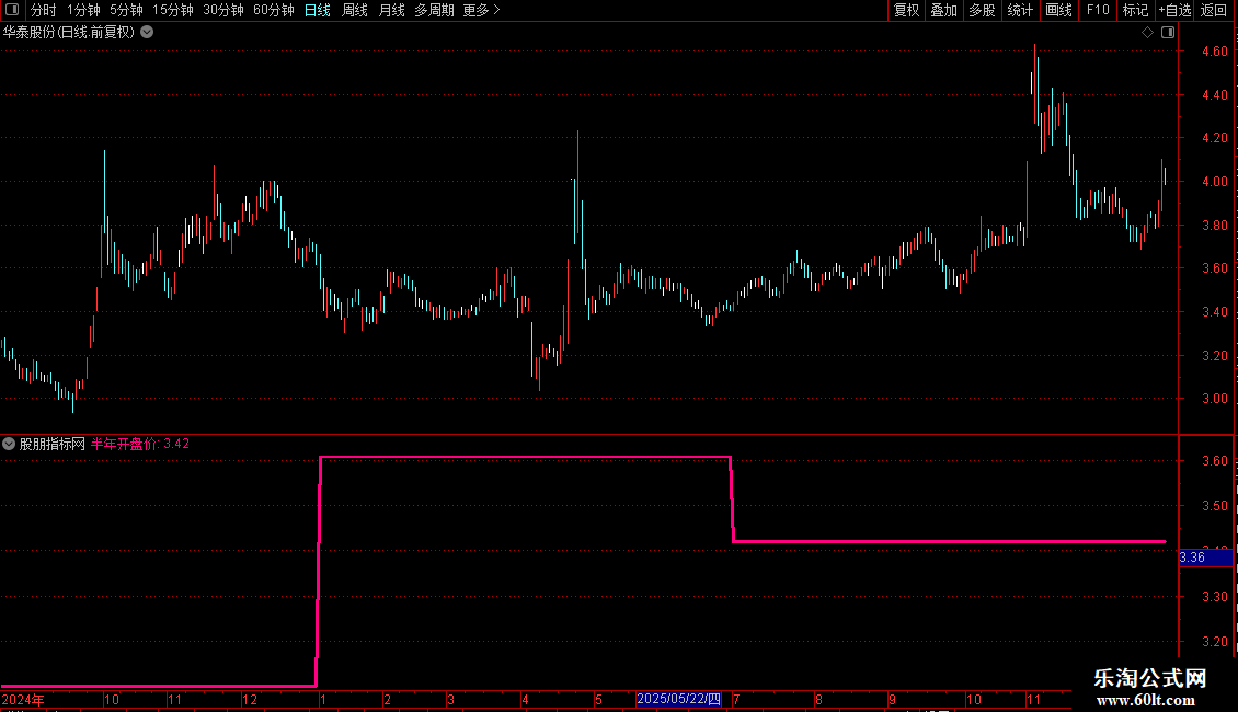 半年开盘价:REF(O,BARSLAST(MOD(MONTH,6)=0)-1),COLORLIMAGENTA,LINETHICK3;