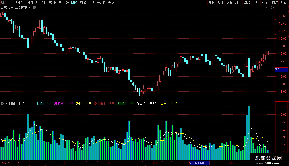 说明:低换手当换手率小于2%时,成交量柱用浅绿色显示