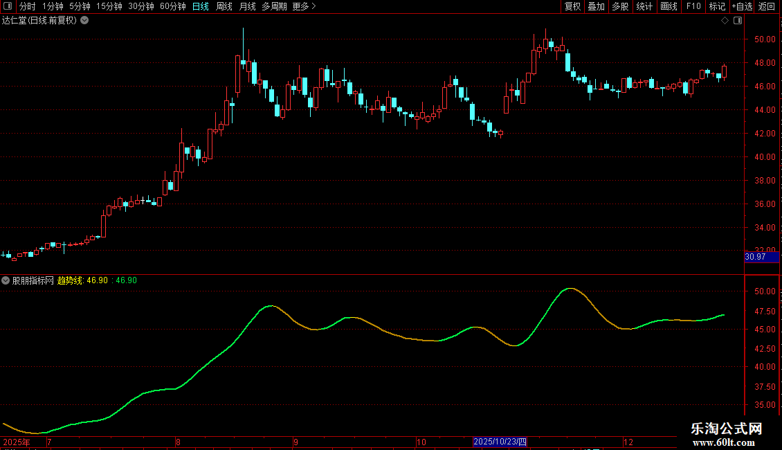 IF(趋势线>REF(趋势线,1),趋势线,DRAWNULL),COLOR44EE00,LINETHICK2;