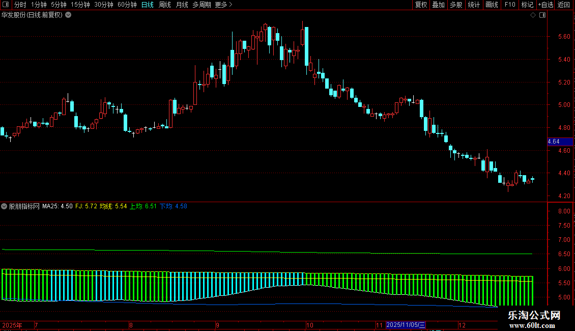 STICKLINE((MA25 >FJ)AND FJ<REF(FJ,1),MA25,FJ,1,0),COLORCYAN;