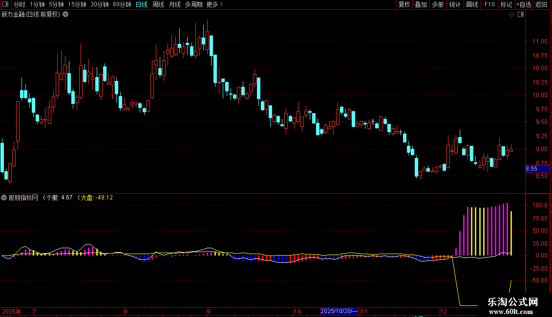 强弱值:=MA(个股-大盘,2),COLORSTICK;