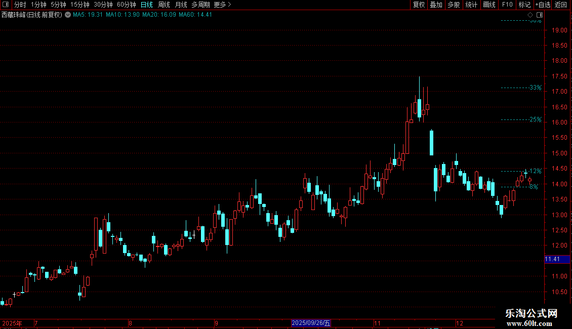 _25%:DRAWLINE(最低=0,L*1.25,ISLASTBAR,低价*1.25,0),COLORAAAA11,DOTLINE;