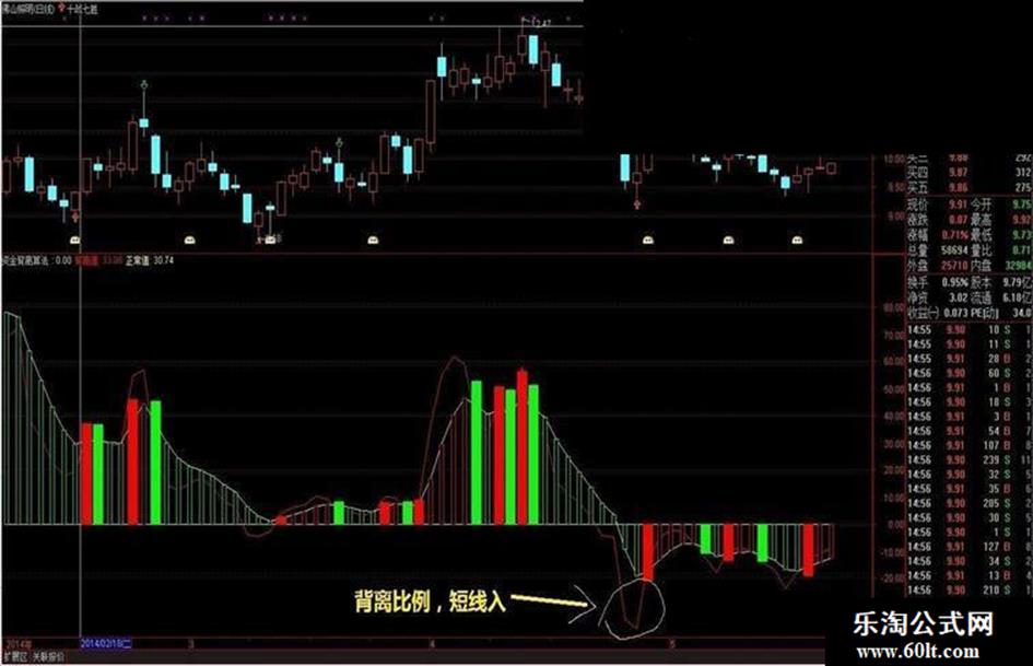0,COLORYELLOW;ZJX1:=EMA(100*(CLOSE-LLV(LOW,100))/(HHV(HIGH,100)-LLV(LOW,100)),13)/4;ZJX2:=EMA(CLOSE,2)-EMA(CLOSE,89);ZJX3:=2*(ZJX2- EMA(ZJX2,30))*10;ZJX4:=EMA(CLOSE,2)-EMA(CLOSE,150);ZJX5:=2*(ZJX4-EMA(ZJX4,100));背离值:(POW(ZJX3,3)*0.1+POW(ZJX3,2))/45+(POW(ZJX5,3)*0.1+POW(ZJX5,1))*5,COLORRED;正常值:EMA(背离值,5),COLORYELLOW;STICKLINE(正常值>REF(正常值,1),0,正常值,1,1),COLORRED;STICKLINE(正常值<=REF(正常值,1),0,正常值,1,1),COLORGREEN;STICKLINE(CROSS(背离值,正常值),0,正常值*1.2,3,0),COLORRED;STICKLINE(CROSS(正常值,背离值),0,正常值*1.2,3,0),COLORGREEN;