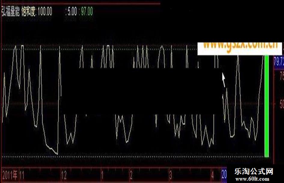 量能≥97:STICKLINE(饱和度>=97 AND ISLASTBAR=1,5,饱和度,8,0),COLORGREEN;DRAWTEXT(ISLASTBAR=1 AND 饱和度,0,'量能饱和度:'+饱和度),COLORFFCCFF;