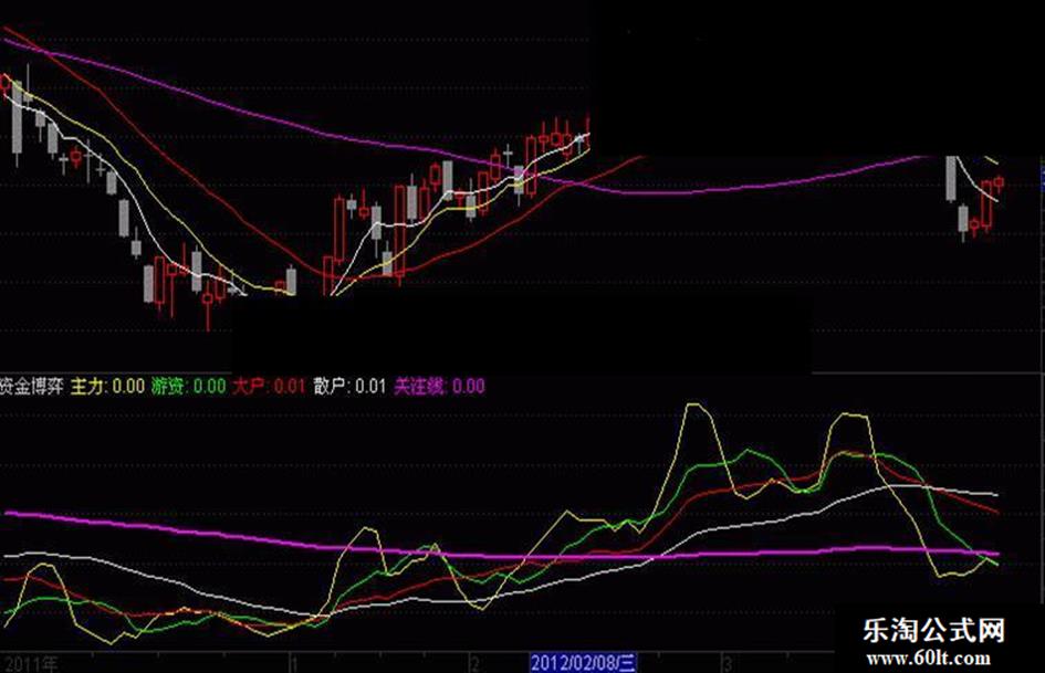 用法:黄线是主力资金线,绿色游资资金线,红色大户资金线,白色散户资金线,紫色是关注线, 没未来函数,请放心使用