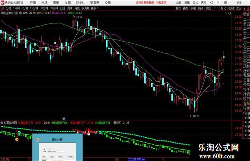DRAWGBK(C>0, RGB(0,0,00),RGB(0,0,0),0,'竹',0);DRAWNUMBER(ISLASTBAR ,C,C),COLORMAGENTA;SJTJ:=DATE<1590301;AA:=Abs((2*CLOSE+HIGH+LOW)/4-MA(CLOSE,30))/MA(CLOSE,30);长期趋势线:=DMA((2*CLOSE+LOW+HIGH)/4,AA);CC:=(CLOSE/长期趋势线);MA1:=MA(CC*(2*CLOSE+HIGH+LOW)/4,3);MAAA:=((MA1-长期趋势线)/长期趋势线)/3;TMP:=MA1-MAAA*MA1;长期趋势上升:IF(TMP>长期趋势线 ,长期趋势线,DRAWNULL),LINETHICK4,COLORRED;IF(TMP>长期趋势线,长期趋势线,DRAWNULL),COLORYELLOW,POINTDOT,LINETHICK4;长期趋势下降:IF(TMP<=长期趋势线,长期趋势线,DRAWNULL),LINETHICK4,COLORGREEN;IF(TMP<=长期趋势线,长期趋势线,DRAWNULL),COLORBLUE,POINTDOT,LINETHICK4;HZS:=crOSS(TMP,长期趋势线);LZS:=CROSS(长期趋势线,TMP);DRAWICON(HZS,长期趋势线-0.1,23);DRAWICON(LZS,长期趋势线+0.1,24);{DRAWICON(TMP<=长期趋势线 AND NOT(LZS),长期趋势线-0.1,14)};{DRAWICON(TMP>长期趋势线 AND NOT(HZS),长期趋势线+0.1,13)};MAH:=(H*18+REF(H,1)*17+REF(H,2)*16+REF(H,3)*15+REF(H,4)*14+REF(H,5)*13+REF(H,6)*12+REF(H,7)*11+REF(H,8)*10+REF(H,9)*9+REF(H,10)*8+REF(H,11)*7+REF(H,12)*6+REF(H,13)*5+REF(H,14)*4+REF(H,15)*3+REF(H,16)*2+REF(H,17)*1)/171;MAL:=(L*18+REF(L,1)*17+REF(L,2)*16+REF(L,3)*15+REF(L,4)*14+REF(L,5)*13+REF(L,6)*12+REF(L,7)*11+REF(L,8)*10+REF(L,9)*9+REF(L,10)*8+REF(L,11)*7+REF(L,12)*6+REF(L,13)*5+REF(L,14)*4+REF(L,15)*3+REF(L,16)*2+REF(L,17)*1)/171;MA5:=MA(CLOSE,5);MA10:=MA(CLOSE,10);MA20:=MA(CLOSE,20);MA60:=MA(CLOSE,60);DK:= SJTJ AND( CLOSE>=MAH OR (C>MA5 AND C>MA10 AND C>MA20 AND C>MA60));KK:= SJTJ AND( MAL>CLOSE OR (C<MA5 AND C<MA10 AND C<MA20 AND C<MA60));DK1:=BArslAST(DK);KK1:=BARSLAST(KK);DK2:=BARSLAST(CROSS(KK1,DK1));KK2:=BARSLAST(CROSS(DK1,KK1));HS:=DK2<KK2;LS:=KK2<DK2;W2:=OPEN-CLOSE;HT:=IF(OPEN>CLOSE,OPEN,CLOSE);LT:=IF(OPEN<CLOSE,OPEN,CLOSE);STICKLINE(W2>0 AND HS,OPEN,CLOSE,2,0),COLORRED;STICKLINE(W2>0 AND HS,OPEN,H,0.0,0),COLORRED;STICKLINE(W2>0 AND HS,C,L,0.0,0),COLORRED;STICKLINE(W2<=0 AND HS,OPEN,CLOSE,2,1),COLORRED;STICKLINE(W2<=0 AND HS,O,L,0.0,0),COLORRED;STICKLINE(W2<=0 AND HS,C,H,0.0,0),COLORRED;STICKLINE(W2>0 AND LS,OPEN,CLOSE,2,0),COLORGREEN;STICKLINE(W2>0 AND LS,OPEN,H,0.0,0),COLORGREEN;STICKLINE(W2>0 AND LS,C,L,0.0,0),COLORGREEN;STICKLINE(W2<=0 AND LS,OPEN,CLOSE,2,1),COLORGREEN;STICKLINE(W2<=0 AND LS,C,H,0.0,0),COLORGREEN;STICKLINE(W2<=0 AND LS,O,L,0.0,0),COLORGREEN;DRAWICON(HS=1 AND REF(LS,1),LOW*0.995,34),COLORYELLOW;DRAWICON(LS=1 AND REF(HS,1),H*1.005,35),COLORYELLOW;DRAWNUMBER(ISLASTBAR AND LS,MAH,MAH),COLORYELLOW;DRAWNUMBER(ISLASTBAR AND HS,MAL,MAL),COLORYELLOW;趋势线:=(MAH+MAL)/2 COLORGREEN,,LINETHICK2;中级趋势上升:IF(HS,趋势线,DRAWNULL),LINETHICK2,COLORRED;中级趋势下降:IF(LS,趋势线,DRAWNULL),LINETHICK2,COLORGREEN;最新价:IF(SJTJ, C,DRAWNULL),LINETHICK0,COLORYELLOW;DRAWTEXT_FIX(C>0,0.004,1,0,EXTERNSTR(0,1)),COLORBLUE,LINETHICK2;