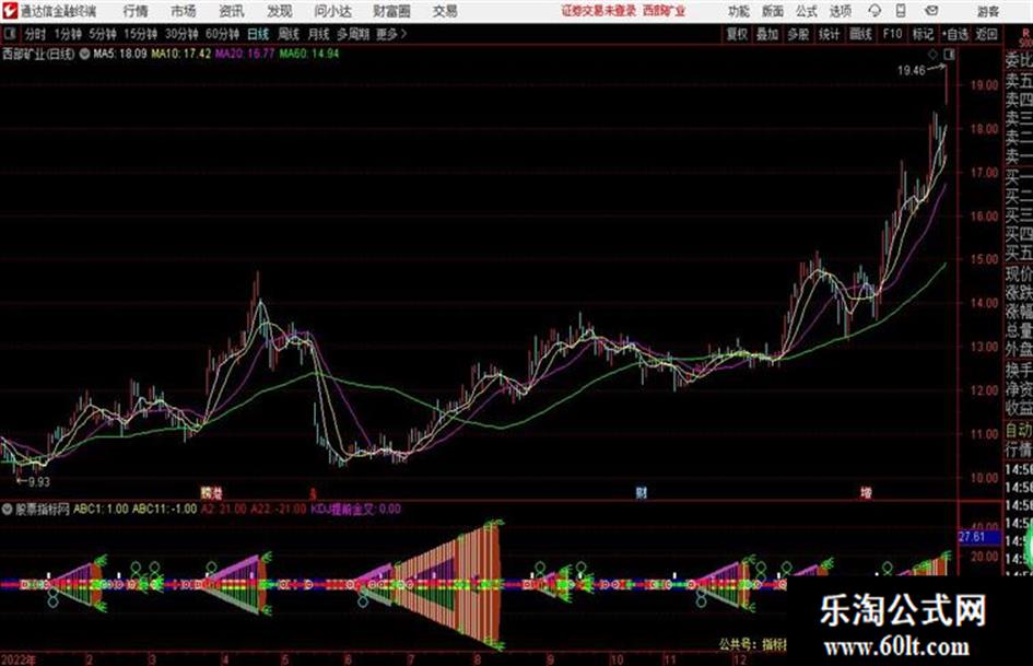VOLUME:=VOL,VOLSTICK;MAVOL5:=MA(VOLUME,5);MAVOL21:=MA(VOLUME,21);MAVOL65:=MA(VOLUME,65);STICKLINE(CROSS(MAVOL5,MAVOL21),5,8,2,0),COLORWHITE;周DIF:=("MACD.DIF#WEEK");周DEA:=("MACD.DEA#WEEK");周MACD:=2*(周DIF-周DEA);DIFF:=EMA(CLOSE,12)-EMA(CLOSE,26);DEA:=EMA(DIFF,9),COLORFFFF00;MACD:=(DIFF-DEA)*2;ABC1:BARSLAST(DIFF< REF(DIFF,1)),COLOR00FFFF,LINETHICK1;ABC11:ABC1*-1,COLOR00FFFF,LINETHICK1;A2:BARSLAST(DEA< REF(DEA,1)),COLORRED,LINETHICK1;A22:A2*-1,COLORRED,LINETHICK1;DRAWBAND(A2,RGB(150,50,20),ABC1,RGB(150,100,150));DRAWBAND(A22,RGB(150,100,150),ABC11,RGB(150,50,20));DRAWTEXT_FIX(1,0.75,0.92,0,'公共号:指标抓牛 '),COLORYELLOW;STICKLINE(周MACD>REF(周MACD,1) AND 周MACD>0,-5,5,18,0),COLORRED;STICKLINE(周MACD< REF(周MACD,1) AND 周MACD>0,-5,5,18,0),COLORYELLOW;STICKLINE(周MACD>REF(周MACD,1) AND 周MACD< 0,-5,5,18,0),COLORLIRED;STICKLINE(周MACD< REF(周MACD,1) AND 周MACD< 0,-5,5,18,0),COLORBLUE;STICKLINE(MACD>REF(MACD,1) AND MACD>0,-3,3,3.5,1),COLORRED;STICKLINE(MACD>REF(MACD,1) AND MACD< 0,-3,3,3.5,1),COLORLIRED;STICKLINE(MACD< REF(MACD,1) AND MACD>0,-3,3,3.5,1),COLORYELLOW;STICKLINE(MACD< REF(MACD,1) AND MACD< 0,-3,3,3.5,1),COLORBLUE;DIIFF:=(EMA(ABC1,5) - EMA(ABC1,10));DEAA:=EMA(DIIFF,3);K线动能:=(DIIFF-DEAA),COLORYELLOW;STICKLINE((K线动能 > 0),-1,1,1.5,0),COLOR0000FF;STICKLINE((K线动能 < 0),-1,1,1.5,0),COLOR00FF00;STICKLINE(CROSS(DIFF,DEA),0,0.04,5,1),COLORYELLOW;STICKLINE(CROSS(DIFF,DEA),0.04,0.08,5,0),COLORRED;STICKLINE(CROSS(DIFF,DEA),0.08,0.12,5,1),COLORYELLOW;STICKLINE(CROSS(DIFF,DEA),0.12,0.16,4,1),COLORRED;STICKLINE(CROSS(DIFF,DEA),0.16,0.2,3,1),COLORRED;STICKLINE(CROSS(DIFF,DEA),0.2,0.24,2,0),COLORWHITE;STICKLINE(CROSS(DIFF,DEA) AND DIFF< 0,ABC11,0,2,0),COLORRED;STICKLINE(CROSS(DIFF,DEA) AND DIFF>0,0,ABC1,2,0),COLORRED;STICKLINE(CROSS(DEA,DIFF) AND DIFF< 0,ABC11,0,2,0),COLORBLUE;STICKLINE(CROSS(DEA,DIFF) AND DIFF>0,0,ABC1,2,0),COLORBLUE;MACD底背离: STICKLINE(REF(CLOSE,ABC1+1)>CLOSE AND DIFF>REF(DIFF,ABC1+1) AND CROSS(DIFF,DEA),-25,25,0.00001,0),COLORYELLOW;STICKLINE(ABC1>0 AND A2>0,A2,ABC1,0.00001,0),COLORFFFFFF;STICKLINE(ABC1>0 AND A2>0,A22,ABC11,0.00001,0),COLORFFFFFF;STICKLINE(ABC1>0 AND A2>0,0,ABC1,0.000001,0),COLORFF00FF;STICKLINE(ABC1>0 AND A2>0,0,ABC11,0.000001,0),COLORGREEN;DRAWTEXT(CROSS(DIFF,DEA) AND DIFF< 0,-5,'〇'),COLORCYAN;DRAWTEXT(CROSS(DIFF,DEA) AND DIFF< 0,-12,'〇'),COLORCYAN;DRAWTEXT(CROSS(DIFF,DEA) AND DIFF>0,5,'〇'),COLORGREEN;DRAWTEXT(CROSS(DIFF,DEA) AND DIFF>0,12,'〇'),COLORGREEN;DRAWTEXT(A2>ABC1 AND A22< ABC11 AND ABC1=0 AND ABC11=0,A2,'∈'),COLORGREEN;DRAWTEXT(A2>ABC1 AND A22< ABC11 AND ABC1=0 AND ABC11=0,0,'∈'),COLORGREEN;DRAWTEXT(A2>ABC1 AND A22< ABC11 AND ABC1=0 AND ABC11=0,A22,'∈'),COLORGREEN;STICKLINE(CROSS(DIFF,DEA) AND DIFF< 0,ABC11,0,2,0),COLORRED;STICKLINE(CROSS(DIFF,DEA) AND DIFF>0,0,ABC1,2,0),COLORRED;STICKLINE(CROSS(DEA,DIFF) AND DIFF< 0,ABC11,0,2,0),COLORBLUE;STICKLINE(CROSS(DEA,DIFF) AND DIFF>0,0,ABC1,2,0),COLORBLUE;N:=5;M1:=5;RSV:=(CLOSE-LLV(LOW,N))/(HHV(HIGH,N)-LLV(LOW,N))*100;K:=SMA(RSV,5,1);D:=SMA(K,M1,5);J:=3*K-2*D;VARB2:=(RSV/2+22)*1;量:=EMA(VOL,13);资金:=EMA(AMOUNT,13);过滤:=((资金 /量) / 100);提纯:=(((CLOSE -过滤) / 过滤) * 100);黄金:=((提纯 < (0)));低买:=IF(黄金 AND RSV< VARB2-2,50,0);高卖:=IF(黄金 AND RSV>VARB2,80,120);上涨分界:=25;KDJ提前金叉:(CROSS(上涨分界,低买)),COLORFF00FF,NODRAW;DRAWTEXT(KDJ提前金叉,0,'⊙'),COLORFFFFFF;