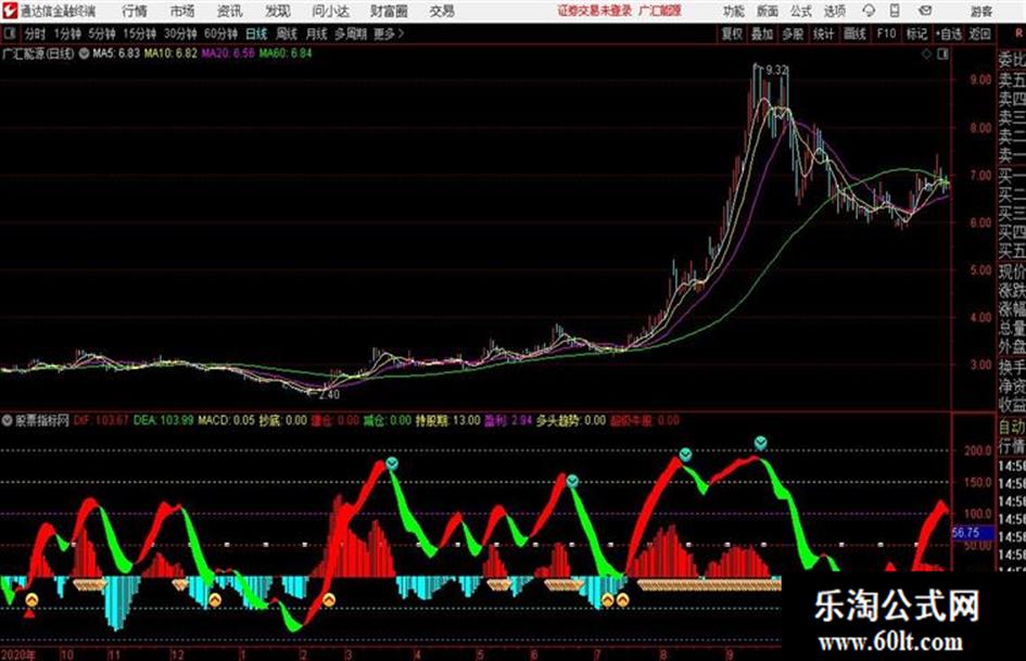 NOTEXT弱势:(-50),DOTLINE,COLORCYAN;NOTEXT平衡:0,NODRAW,COLOR00FFCC;NOTEXT强势:50,DOTLINE,COLORRED;NOTEXT极强:100,DOTLINE,COLORMAGENTA;NOTEXT暴强:150,DOTLINE,COLOR00CCFF;NOTEXT燃烧:200,DOTLINE,COLOR999999;XA_1:=EMA(CLOSE,12)-EMA(CLOSE,26);XA_2:=EMA(XA_1,9);XA_3:=HHV(MAX(XA_1,XA_2),250);XA_4:=INTPART(100/XA_3);XA_5:=2*XA_4*XA_1+0;XA_6:=2*XA_4*XA_2+0;XA_7:=XA_5-XA_6;STICKLINE(XA_7>=0 AND XA_7>=REF(XA_7,1),0,XA_7,2,1),COLORRED;STICKLINE(XA_7>=0 AND XA_7<REF(XA_7,1),0,XA_7,2,0),COLORRED;STICKLINE(XA_7<0 AND XA_7>=REF(XA_7,1),0,XA_7,2,1),COLORCYAN;STICKLINE(XA_7<0 AND XA_7<REF(XA_7,1),0,XA_7,2,0),COLORCYAN;XA_8:=(HIGH+LOW+CLOSE*2)/4;XA_9:=EMA(XA_8,10);XA_10:=STD(XA_8,10);XA_11:=(XA_8-XA_9)*100/XA_10;XA_12:=EMA(XA_11,5);DIF:EMA(XA_12+55,9),COLORRED;DEA:EMA(DIF,7),COLORGREEN;MACD:(XA_1-XA_2)*2,NODRAW,COLORYELLOW;DRAWBAND(DIF,RGB(255,0,0),DEA,RGB(0,255,0));抄底:CROSS(DIF,DEA) AND DIF<0 AND CROSS(CLOSE,MA(CLOSE,5)),NODRAW,COLORYELLOW;DRAWICON(抄底,LLV(DIF,10),38);建仓:CROSS(DIF,0),NODRAW,COLORRED;DRAWICON(建仓,(-25),34);减仓:CROSS(DEA,DIF) AND DIF>125,NODRAW,COLORGREEN;DRAWICON(减仓,DIF*1.2,35);持股期:BARSLAST(建仓),NODRAW,COLORYELLOW;盈利:100*(HIGH-REF(HIGH,持股期))/REF(CLOSE,持股期),NODRAW,COLORMAGENTA;多头趋势:DIF>100 AND CLOSE>MA(CLOSE,21) AND MA(CLOSE,13)>MA(CLOSE,21) AND MA(CLOSE,21)>MA(CLOSE,55) AND MA(CLOSE,55)>MA(CLOSE,144),NODRAW,COLORYELLOW;超级牛股:多头趋势 AND REF(多头趋势,1)=0,NODRAW,COLORRED;DRAWICON(多头趋势,0,26);