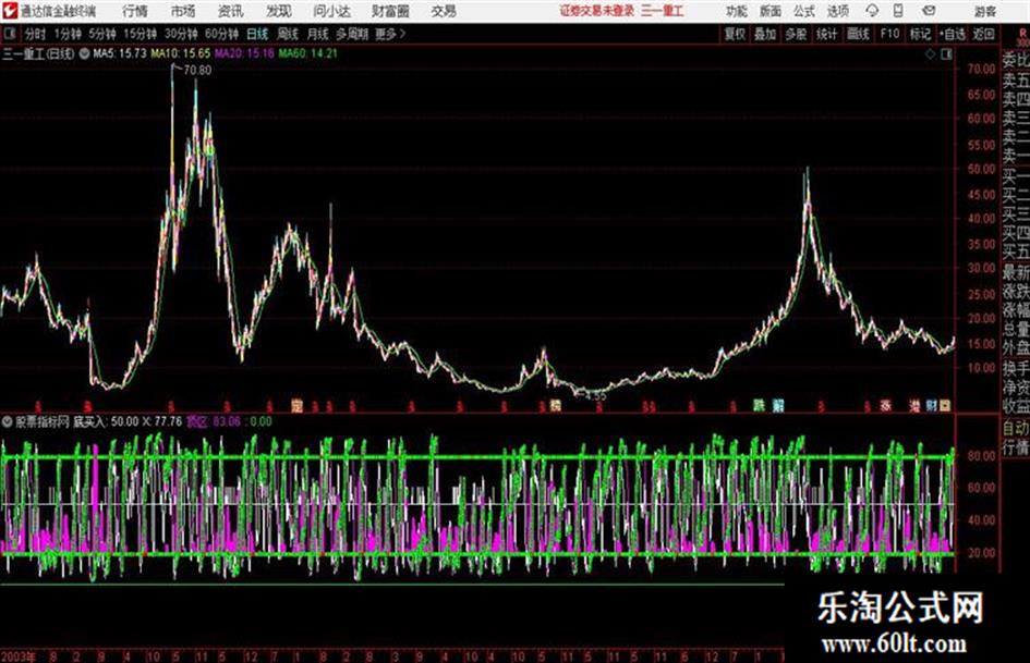 V1:=(C+H+L+O)/4;V2:=SUMBARS(VOL,CAPITAL);V3:=HHV(V1,V2);V4:=LLV(V1,V2);V5:=(2*V1-V4-REF(V4,1))/(V3-V4);V6:=(V1-V4)/(V3-V4);V7:=IF(V1<= V4,V5*60,V6*60);顶到底:= IF(V7> 0,V7+20,20);V8:=600*(EMA(C,3)-EMA(L,30))/EMA(L,30);V9:=EMA(V8,7);{ITEMTITLE:"顶到底","底买入","X","顶区";}VA:=(WINNER(120*C/100)-WINNER(100*C/100))*100;VB:=(-100)*(WINNER(120*C/100)-WINNER(100*C/100))+5;底买入: IF(VA+VB< 7 AND CROSS(V8,V9) AND V9< -18 AND V9< VB,60,50);VC:=(2*C+H+L)/4;VD:=LLV(L,34);VE:=HHV(H,34);VF:=LLV(L,21);V10:=HHV(H,21);V11:=EMA((VC-VF)/(V10-VD)*100,5);V12:=EMA((VC-VD)/(VE-VD)*100,8);X:V11,colorwhite;顶区:V12;STICKLINE(V11-V12+20>=20 ,V11-V12+20 ,20 ,5 ,0 ),COLORF000FF;V13:=EMA(V12,5);STICKLINE(V12>0 AND (V12-V13)>=0 ,80 ,78 ,6 ,0 ),colorred;STICKLINE(V12>0 AND (V12-V13)<0 ,80 ,78 ,6 ,1 ),colorgreen;STICKLINE(V12>0 AND (V12-V13)>=0 ,20 ,18 ,6 ,0 ),colorred;STICKLINE(V12>0 AND (V12-V13)<0 ,20 ,18 ,6 ,1 ),colorgreen;STICKLINE(V12>V13 , V12,V13,15 ,1 ),colorgreen;0;