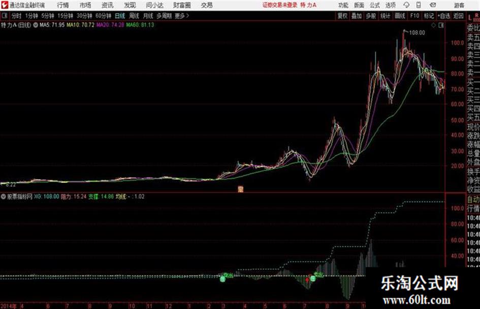 XG:HHV(H,480),DOTLINE,COLORCYAN;RQ:=DATETODAY(DATE)-DATETODAY(REF(DATE,TOTALBARSCOUNT-CURRBARSCOUNT))+1;JY:=BARSLAST((RQ-REF(RQ,1))!=WEEKDAY-REF(WEEKDAY,1) OR TOTALBARSCOUNT-CURRBARSCOUNT=0)+1;MA1:=REF(C,JY);MA2:=REF(MA1,JY);MA3:=REF(MA2,JY);MA4:=REF(MA3,JY);MA5:=REF(MA4,JY);MA6:=REF(MA5,JY);MA7:=REF(MA6,JY);MA8:=REF(MA7,JY);MA9:=REF(MA8,JY);H1:=MAX(DYNAINFO(3),DYNAINFO(5));L1:=MIN(DYNAINFO(3),DYNAINFO(6));P1:=H1-L1;阻力:L1+P1*8/9,COLORLIRED,DOTLINE;支撑:L1+P1*0.5/9,COLORGREEN,DOTLINE;均线:IF(BETWEEN(C/(SUM(AMOUNT,0)/SUM(VOL*100,0)),1.05,0.95)=0,MA(C,0),(SUM(AMOUNT,0)/SUM(VOL*100,0))),COLORYELLOW,DOTLINE;DIF:=(EMA(CLOSE,12)-EMA(CLOSE,26))+DYNAINFO(3);DEA:=EMA(DIF,9);MACD1:=10*(DIF-DEA);MACD2:=EMA(MACD1,2);STICKLINE(MACD1>=MACD2 AND MACD1>=0,DYNAINFO(3),MACD1+DYNAINFO(3),0,-1),COLORLIGRAY;STICKLINE(MACD1< MACD2 AND MACD1>0,DYNAINFO(3),MACD1+DYNAINFO(3),0,-1),COLORLICYAN;STICKLINE(MACD1>=MACD2 AND MACD1< 0,DYNAINFO(3),MACD1+DYNAINFO(3),0,-1),COLORLIGRAY;STICKLINE(MACD1< MACD2 AND MACD1< 0,DYNAINFO(3),MACD1+DYNAINFO(3),0,-1),COLORLIGREEN;XX:=SUM(AMOUNT,BARSCOUNT(CLOSE))/SUM(V*100,BARSCOUNT(CLOSE));主力:=EXPMA(CLOSE/XX,20);大户:=EXPMA(CLOSE/XX,60);散户:=EXPMA(CLOSE/XX,120);底:=1;1.022,NODRAW;高:=1.033;DRAWTEXT(CROSS(主力,1.02),C*0.999,' 拉'),COLORMAGENTA;DRAWICON(CROSS(主力,1.04),C,45);DRAWTEXT(CROSS(主力,1.04),C*0.999,' 冲'),COLORRED;A1:=(VOL/CLOSE)/3;A2:=SUM((IF(((A1>40) AND (CLOSE>(REF(CLOSE,1)))),A1,0)),0);A3:=SUM((IF(((A1>40) AND (CLOSE< (REF(CLOSE,1)))),A1,0)),0);A4:=SUM((IF(((A1< 40) AND (CLOSE>(REF(CLOSE,1)))),A1,0)),0);A5:=SUM((IF(((A1< 40) AND (CLOSE< (REF(CLOSE,1)))),A1,0)),0);A6:=((A2+A3)+A4)+A5;A7:=IF((BARSTATUS=2),((100*A2)/A6),0);A8:=((IF((BARSTATUS=2),((100*A3)/A6),0)));A9:=((IF((BARSTATUS=2),((100*A4)/A6),0)));A10:=((IF((BARSTATUS=2),((100*A5)/A6),0)));DRAWTEXT(LONGCROSS(支撑,C,2),C-0.01,' 买入'),COLOR0000FF;DRAWICON(LONGCROSS(支撑,C,2),C-0.01,1);STICKLINE(LONGCROSS(支撑,C,2),C,阻力,0,-1),COLORCYAN;DRAWTEXT(LONGCROSS(C,阻力,2),C+0.01,' 卖出'),COLORGREEN;DRAWICON(LONGCROSS(C,阻力,2),C+0.01,45);