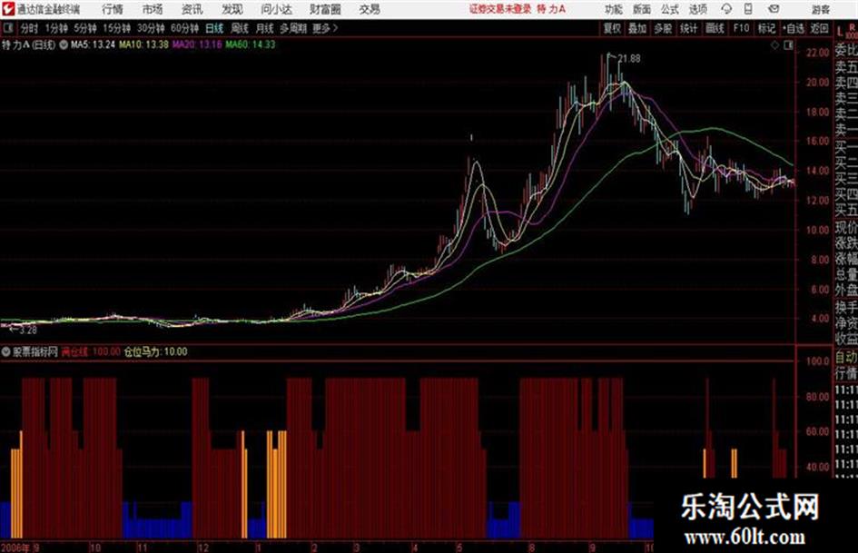 当满足条件(控盘(0AND仓位马力>=60)时,在0和仓位马力位置之间画柱状线,宽度为3.00,0不为0则画空心柱.,COLOR0088FF