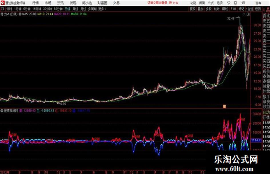 通达信筹码大涨副图指标,红色紫色线粘合快速与蓝色灰蓝色线上下分开,大角度向上,就是牛股妖股开启时刻。