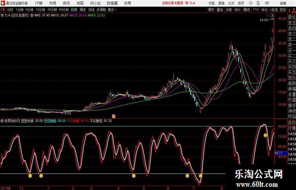 条件:=CROSS(不以涨喜,不以跌悲) AND 不以涨喜<40;