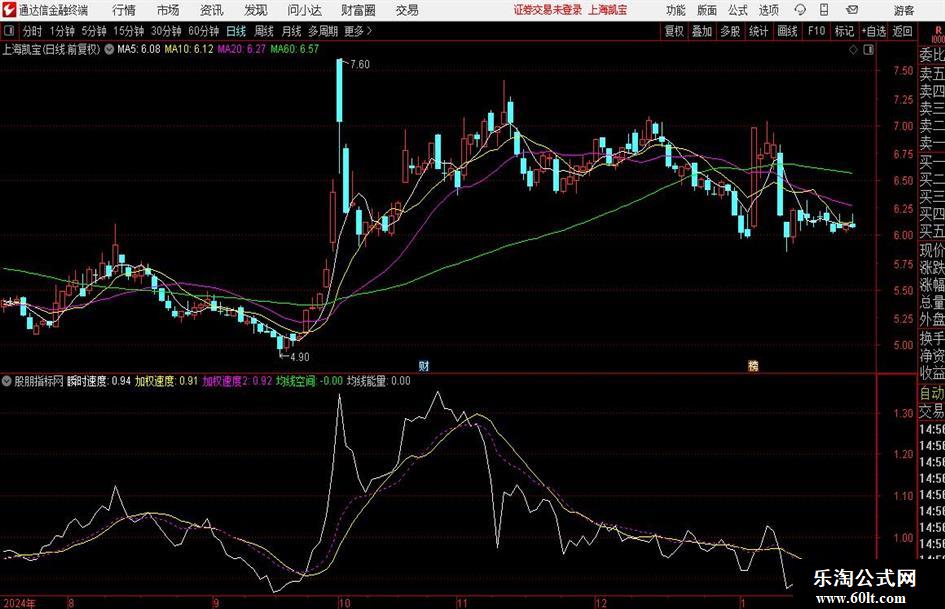 N:=24;M:=12;瞬时速度:(H+L)/REF(H+L,N);加权速度:MA(瞬时速度,M);加权速度2:EMA(瞬时速度,M),DOTLINE;均线空间:(HHV(H-MA(C,N),M)-LLV(MA(C,N)-L,M))/100,NODRAW;均线能量:均线空间*(加权速度2-加权速度),NODRAW;