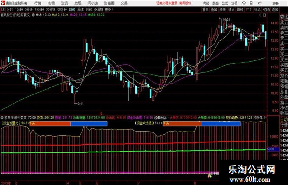 资金攻击度:IF(攻击比>=0,(攻击比+50),100-ABS((攻击比-50))),COLORMAGENTA;