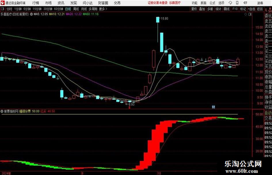 强弱分界: 50,coloryellow;VAR1:=(HHV(HIGH,13) - LLV(LOW,13));VAR2:=(HHV(HIGH,13) - CLOSE);VAR3:=(CLOSE - LLV(LOW,13));VAR4:=(((VAR2 / VAR1) * 100) - 70);VAR5:=(((CLOSE - LLV(LOW,60)) / (HHV(HIGH,60) - LLV(LOW,60))) * 100);VAR6:=((((2 * CLOSE) + HIGH) + LOW) / 4);VAR7:=SMA(((VAR3 / VAR1) * 100),3,1);VAR8:=LLV(LOW,34);VAR9:=(SMA(VAR7,3,1) - SMA(VAR4,9,1));VAR10:=IF((VAR9 > 100),(VAR9 - 100),0);VAR11:=HHV(HIGH,34);VAR12:=EMA((((VAR6 - VAR8) / (VAR11 - VAR8)) * 100),13);VAR13:=EMA(((0.667 * REF(VAR12,1)) + (0.333 * VAR12)),2);STICKLINE(((VAR12 - VAR13) > 0),VAR12,VAR13,12,0), colorred;STICKLINE(((VAR12 - VAR13) < 0),VAR12,VAR13,8,0), colorgreen;红买:EMA(VAR13,5), colorred;