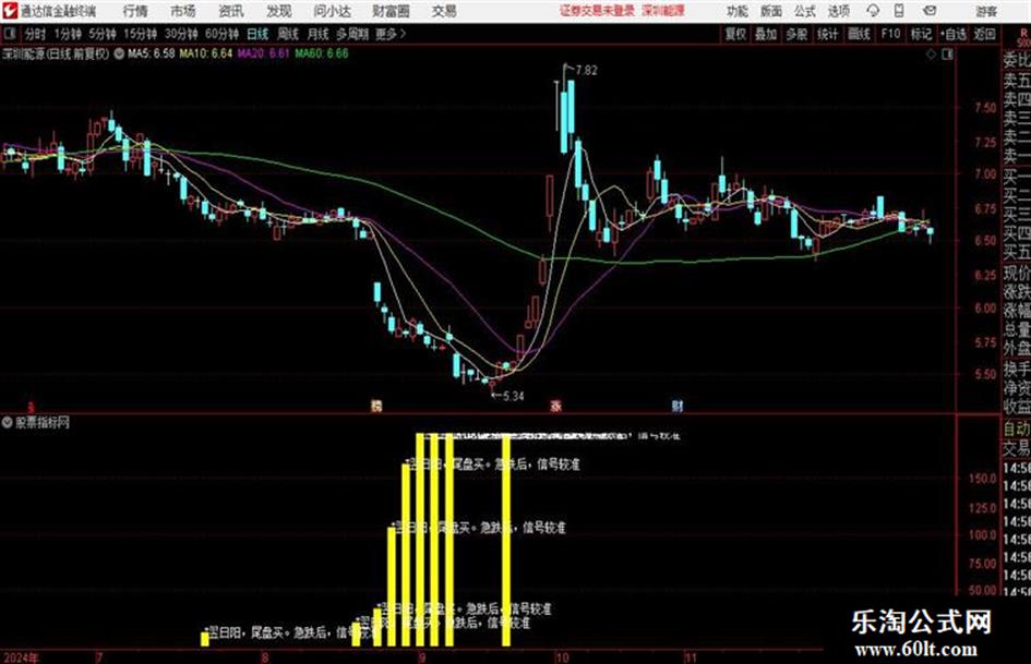 VARF:=HHV(VARD,30);VAR10:=IF(MA(CLOSE,58),1,0);AA3:=( EMA(IF(LOW<=VARE,(VARD+VARF*2)/2,0),3)/618*VAR10) ;BB:=AA3>REF(HHV(AA3,60),1);CC:=HHV(AA3,60);大底:=FILTER(AA3>10 ,1) ;VA1:=VOL/((HIGH-LOW)*2-ABS(CLOSE-OPEN));主买1:=IF(CLOSE>OPEN,VA1*(HIGH-LOW),IF(CLOSE<OPEN,VA1*((HIGH-OPEN)+(CLOSE-LOW)),VOL/2));主卖1:=IF(CLOSE>OPEN,0-VA1*((HIGH-CLOSE)+(OPEN-LOW)),IF(CLOSE<OPEN,0-VA1*(HIGH-LOW),0-VOL/2));AA6:=(主买1-(-主卖1))/主买1;STICKLINE(大底>0 AND C<O ,0,CC,4,0),COLORYELLOW;DRAWTEXT(大底>0 AND C<O,CC,'*翌日阳,尾盘买。急跌后,信号较准');