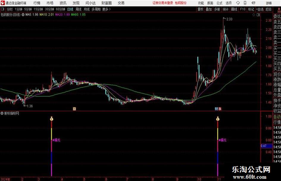 5、当上述所有条件同时满足时,横盘起爆擒牛指标将发出"钱袋子-擒牛"信号。