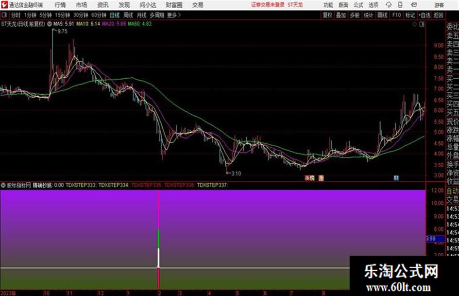 输出TDXSTEP313:当满足条件如果精确抄底,返回(-120),否则返回0时,在9和0位置之间画柱状线,宽度为4,0不为0则画空心柱.,COLORDD00DD