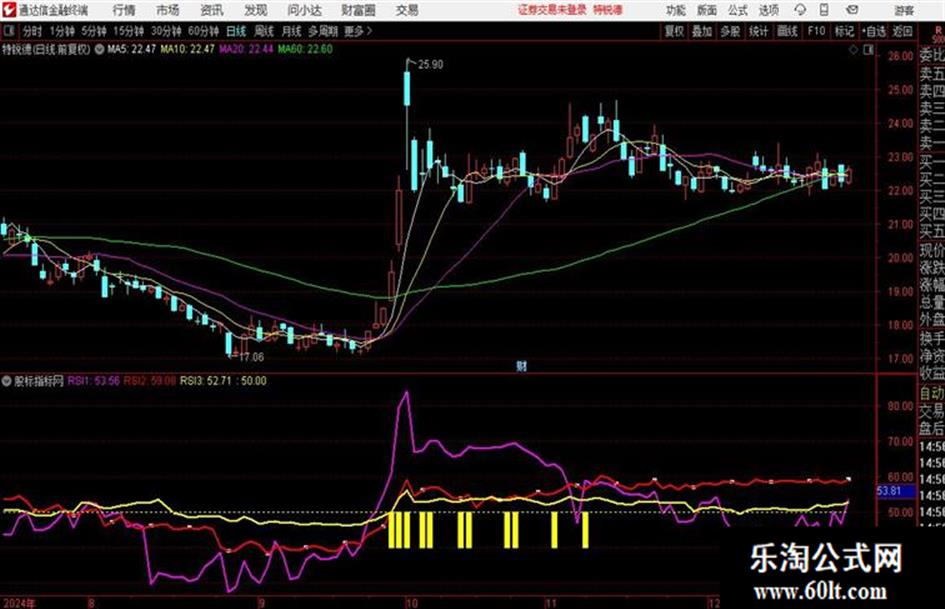 STICKLINE(C>MA(C,60) AND MA(C,60)>REF(MA(C,60),1) AND RSI3>45 AND RSI2>RSI3 AND RSI1>RSI2 AND RSI1>REF(RSI1,1),50,40,2,0),COLORYELLOW;