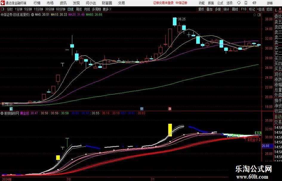 【有金矿】:=COUNT(CLOSE<黄金线,5)=4 AND CLOSE/黄金线>1.004 AND