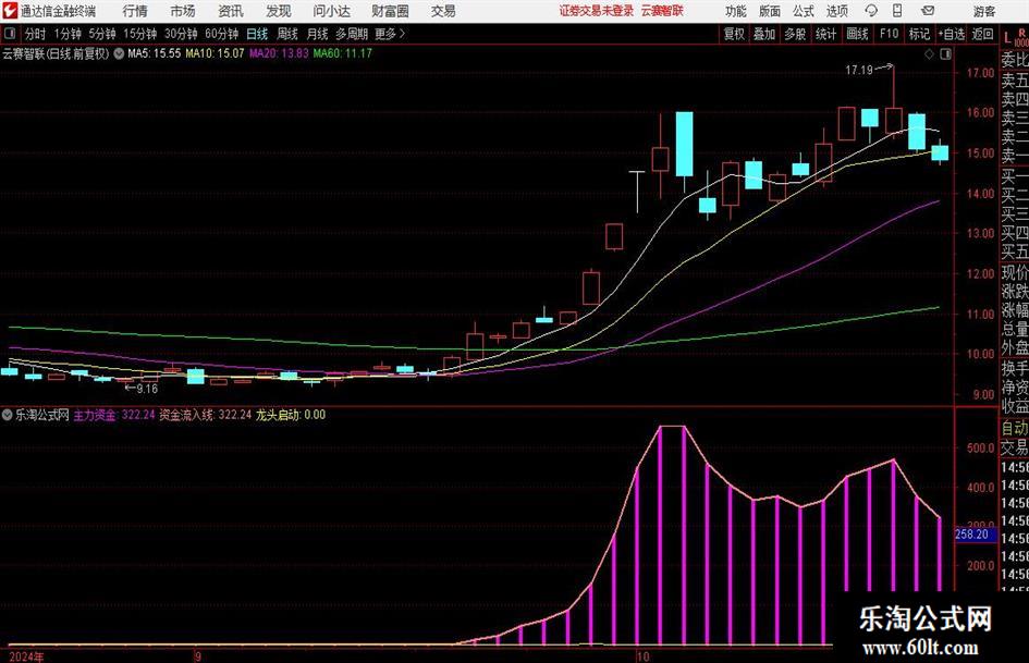 游资筹码:=C;gspt1:=MA(WINNER(游资筹码*0.9)*100*游资筹码,3);gspt2:=IF(gspt1>10,gspt1,0)/2;主力资金:gspt2,STICK,COLORMAGENTA,LINETHICK4;资金流入线:gspt2,COLORLIRED,LINETHICK2;资金均量线:=MA(gspt2,5),COLORMAGENTA,LINETHICK2;gspt3:=IF(DATETODAY(DATE)< 9872,1,DRAWNULL);gspt4:=4*SMA((游资筹码-LLV(LOW,5))/(HHV(HIGH,5)-LLV(LOW,5))*100,5,1)-3*SMA(SMA((游资筹码-LLV(LOW,5))/(HHV(HIGH,5)-LLV(LOW,5))*100,5,1),3.2,1);gspt5:=8;gspt6:=2342.459961*500;gspt7:=IF(DATE< gspt6,1,DRAWNULL);gspt8:=CROSS(gspt4,gspt5);gspt9:=CROSS(gspt4,gspt5) AND HIGH>REF(HIGH,1) AND 游资筹码>REF(游资筹码,1);gspt10:=CROSS(gspt5,gspt4);gspt11:=LLV(LOW,21);gspt12:=HHV(HIGH,21);gspt13:=EMA((游资筹码-gspt11)/(gspt12-gspt11)*100,5);gspt14:=EMA((游资筹码-gspt11)/(gspt12-gspt11)*50,13);gspt15:=CROSS(gspt13,gspt14);gspt16:=IF(游资筹码>REF(游资筹码,1),88,0);gspt17:=IF(游资筹码/REF(游资筹码,1)>1.05 AND HIGH/游资筹码< 1.01 AND gspt16>0,91,0);龙头启动:FILTER(gspt17>90,45)=1 AND MA(C,5)>MA(C,10),COLORYELLOW;资金启动:=BARSLASTCOUNT(资金流入线>5)=1 AND MA(C,5)>MA(C,10);STICKLINE(龙头启动 AND 资金启动,0,100,2,0),COLORYELLOW,LINETHICK4;STICKLINE(龙头启动 AND 资金启动,0,100,1,0),COLORRED,LINETHICK2;DRAWICON(龙头启动 AND 资金启动,110,9);DRAWICON(龙头启动 AND 资金启动,105,23);