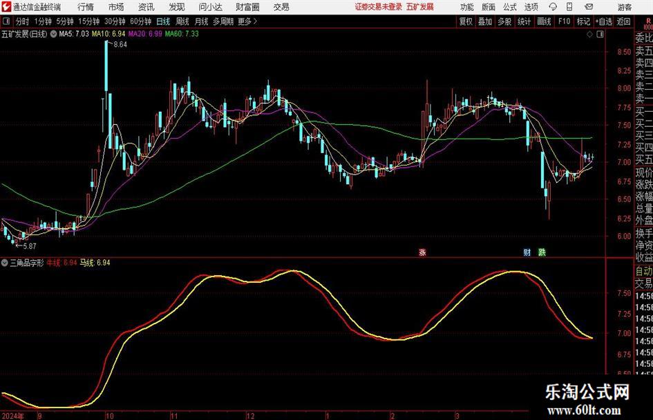 MID:=(3*CLOSE+LOW+OPEN+HIGH)/6;牛线:(20*MID+19*REF(MID,1)+18*REF(MID,2)+17*REF(MID,3)+16*REF(MID,4)+15*REF(MID,5)+14*REF(MID,6)+13*REF(MID,7)+12*REF(MID,8)+11*REF(MID,9)+10*REF(MID,10)+9*REF(MID,11)+8*REF(MID,12)+7*REF(MID,13)+6*REF(MID,14)+5*REF(MID,15)+4*REF(MID,16)+3*REF(MID,17)+2*REF(MID,18)+REF(MID,20))/210,COLORRED,LINETHICK2;马线:MA(牛线,6),,COLORYELLOW,LINETHICK2;