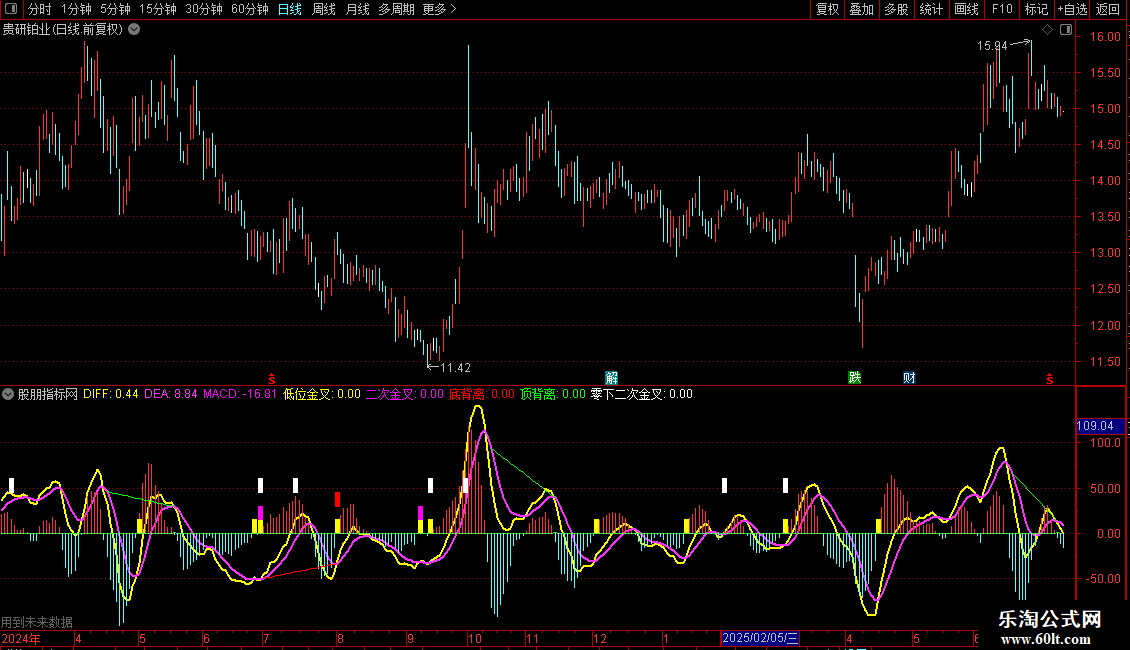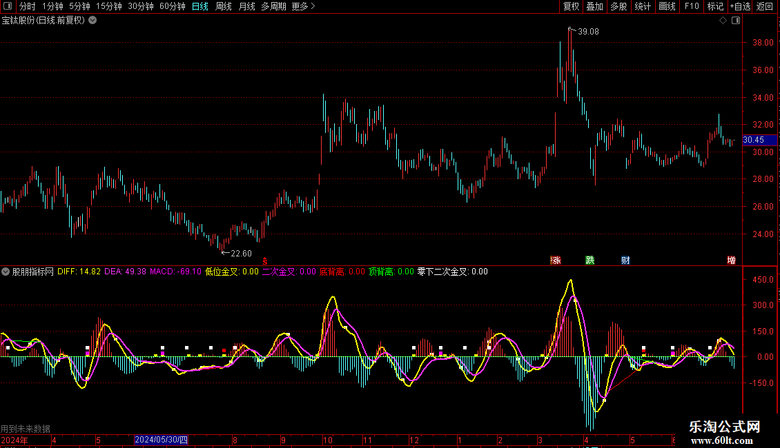 低位金叉:IF(CROSS(DIFF,DEA) AND DIFF<-0.1,0.3,0),COLORYELLOW,POINTDOT;