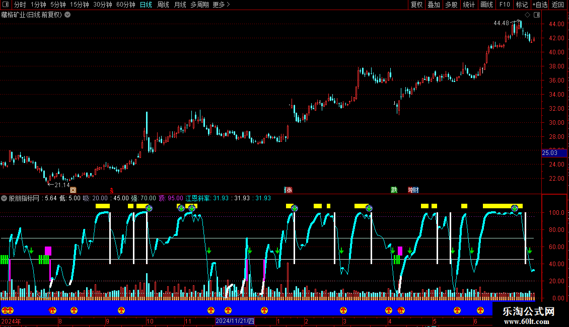 IF(江恩斜率>20 AND 江恩斜率>REF(江恩斜率,1),江恩斜率,DRAWNULL),LINETHICK4,COLORFFFF00;