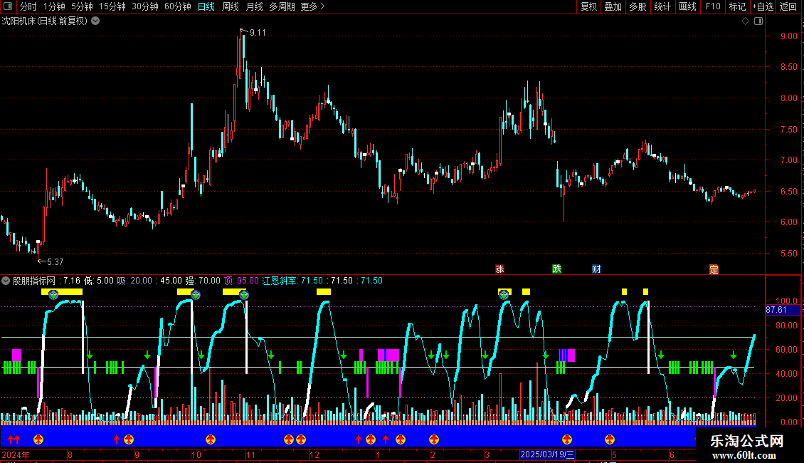 趋势线:=1.06*(3*SMA((C-LLV(L,27))/(HHV(H,27)-LLV(L,27))*100,5,1)-2*SMA(SMA((C-LLV(L,27))/(HHV(H,27)-LLV(L,27))*100,5,1),3,1)-50)+50;