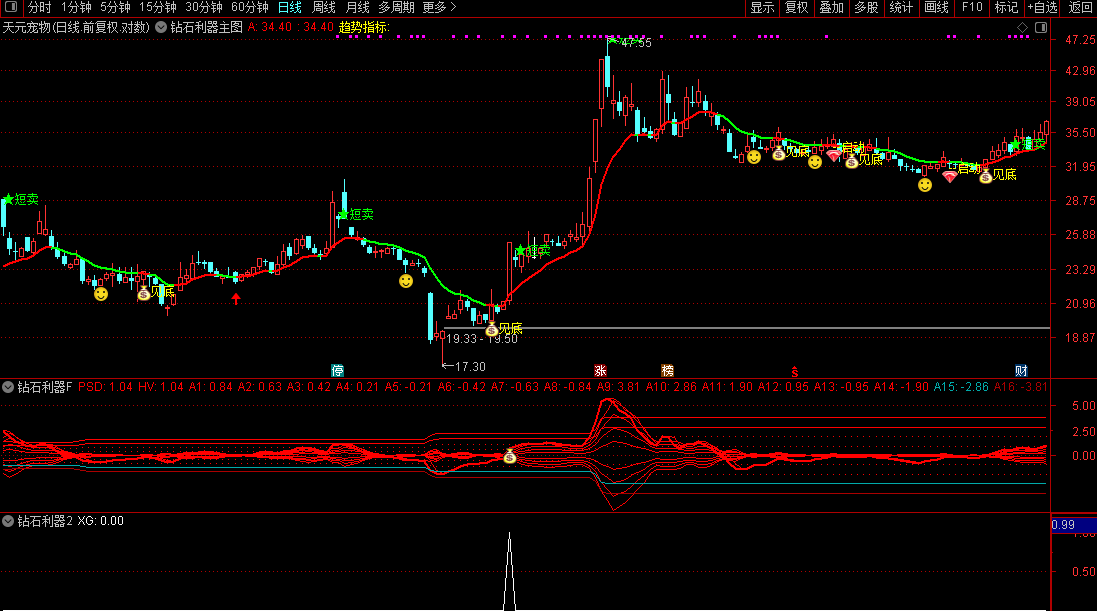 主图“钻石”图标=右侧启动信号,副图同期“钱袋子图标+趋势线明显发散”=右侧启动双保险。