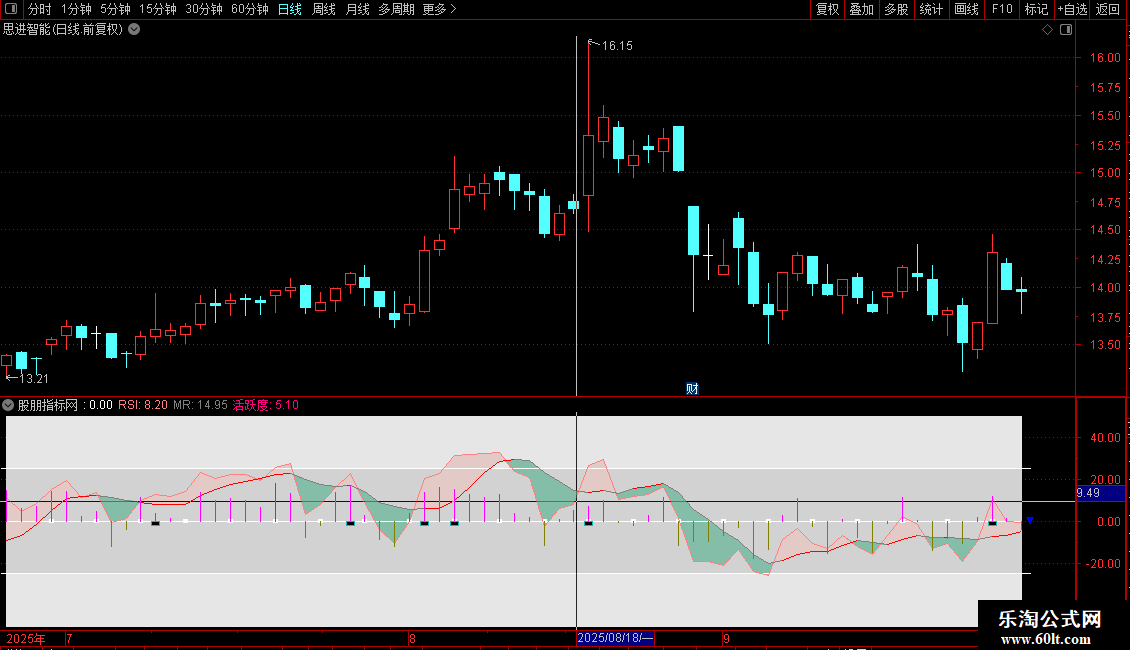 DRAWTEXT(ISLASTBAR AND RSI>REF(RSI,1),0,' ▲'),COLORDD00FF;