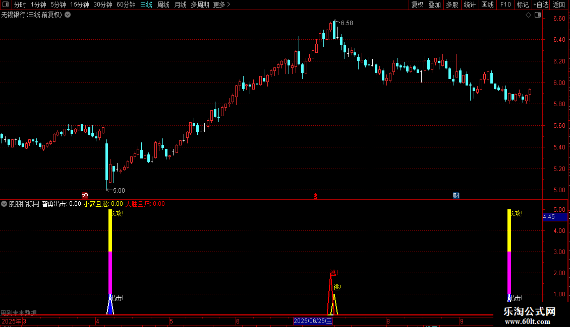 大胜且归:IF(顶>REF(顶,1),2,0),COLORRED,LINETHICK2; DRAWTEXT(大胜且归=2,2,'逃!'),COLORRED;