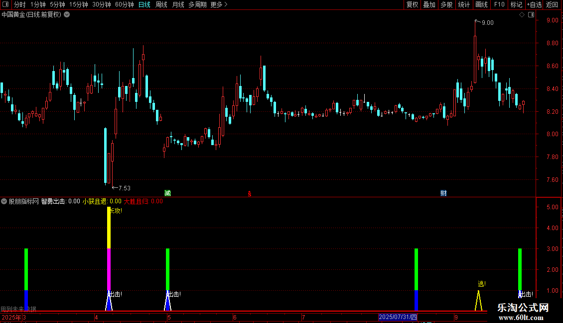 智勇出击: ZIG(3,6)>REF(ZIG(3,6),1)AND REF(ZIG(3,6),1)<REF(ZIG (3,6),2),COLORWHITE,LINETHICK2; DRAWTEXT(智勇出击=1,0.8,'出击!'),COLORWHITE;