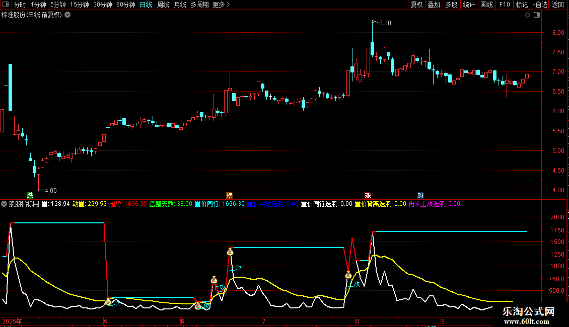 DRAWTEXT(量价突破选股>0,(量*0.699),'上攻'),COLORCYAN;
