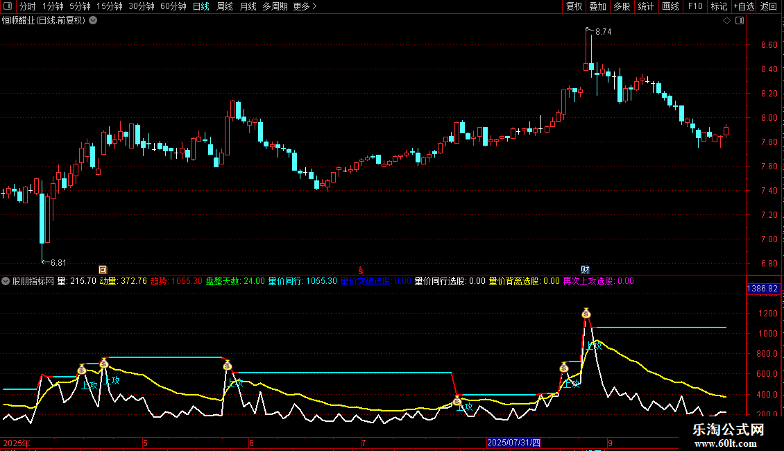 量价突破选股:IF(((((量 = 趋势) AND (CLOSE > REF(CLOSE, 1))) AND (量 > REF(量, 1))) AND (REF(A08, 2) > 0)), 888,0),LINETHICK0;