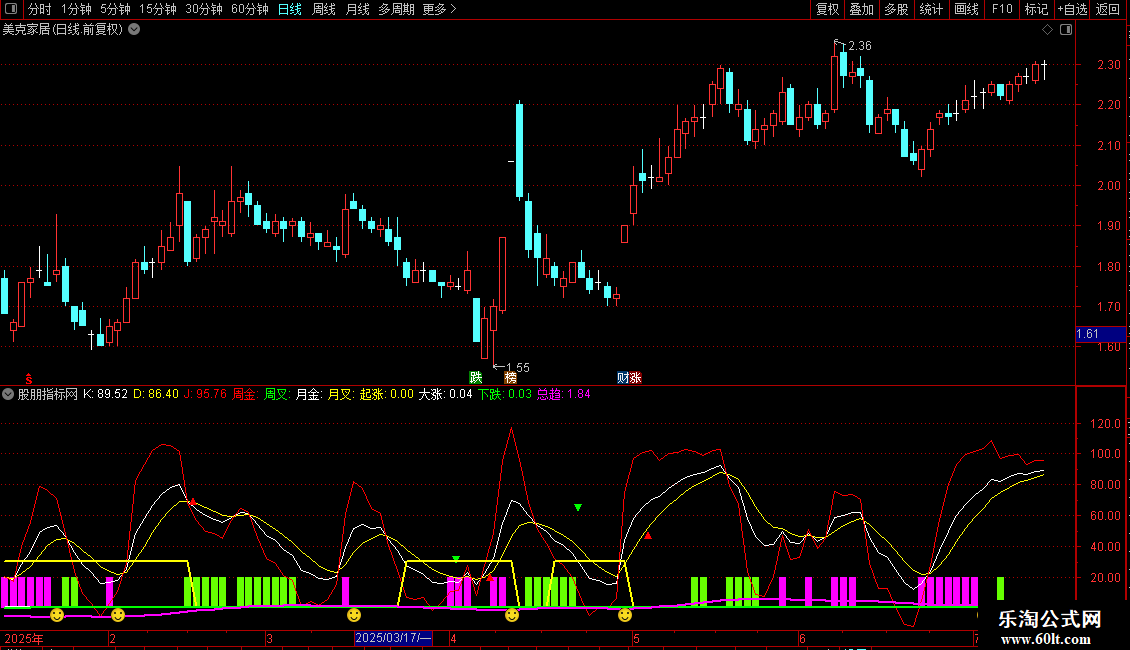 月金:DRAWTEXT(CROSS(REF(月K,1),REF(月D,1)) ,D,'▲'),COLORWHITE;