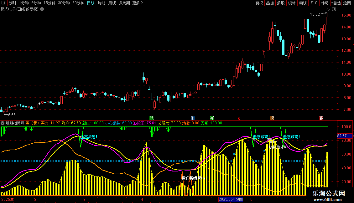 DRAWTEXT(CROSS(波段鬼,波段王) AND 波段鬼>75,85,'逢高减磅!'),COLORFFFF00 , ;