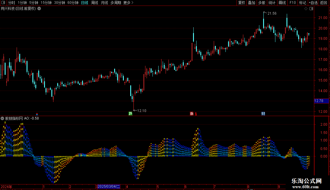 STICKLINE(AO>=REF(AO,1),(AO-AO*0.6),(AO-AO*0.75),5,-1) COLOR00CCFF;