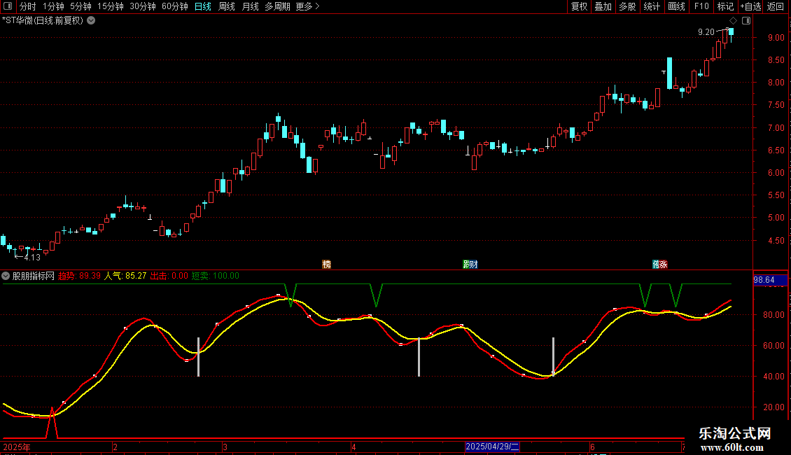 短卖:IF(CROSS(人气,趋势) AND (人气>75),85,100),COLOR008000,LINETHICK2;