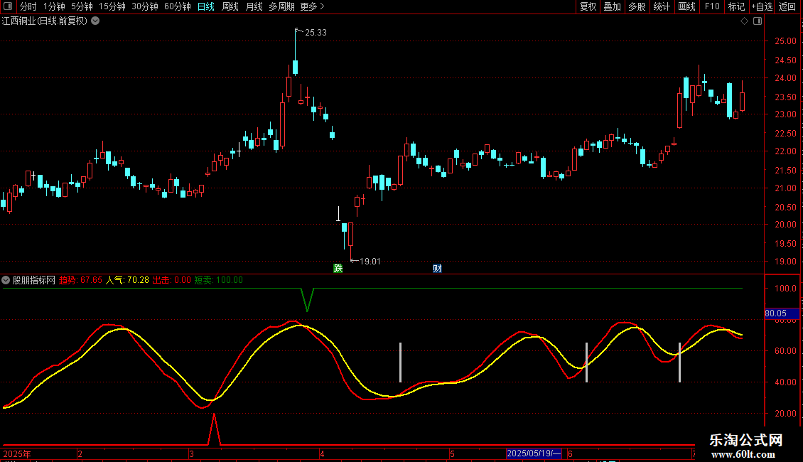 出击:IF(CROSS(趋势,人气) AND (趋势<30),20,0),COLOR0000FF,LINETHICK2;